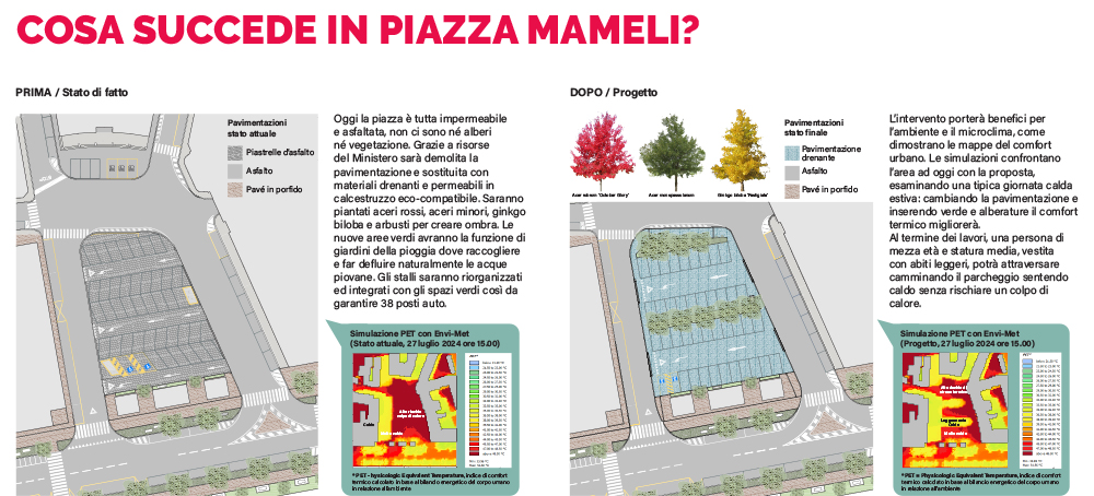 Il progetto di piazza Mameli è un progetto di riqualificazione urbana che mira ad aumentare la capacità di adattamento al cambiamento climatico: l’obiettivo del progetto, oltre all’adeguamento normativo e funzionale, è infatti quello di migliorare il comfort climatico (abbassamento delle temperature) attraverso la piantumazione di alberi e arbusti e di ottenere una gestione razionale delle acque mediante la creazione di aiuole con funzione di rain garden (i “giardini della pioggia” sono aiuole in erba, ribassate rispetto al piano strada, che sono in grado di intercettare le acque piovane di strade ed edifici limitrofi, favorendo l’infiltrazione di acqua nel terreno e riducendo quindi il ruscellamento superficiale).