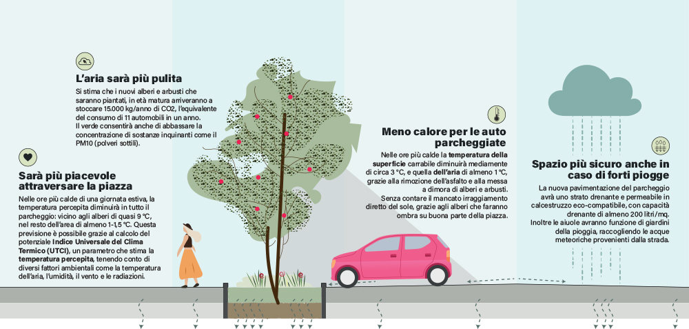 Gli interventi consistono nella “depavimentazione” del parcheggio (sostituendo quindi la precedente pavimentazione impermeabile) e nell’inserimento di alberature.